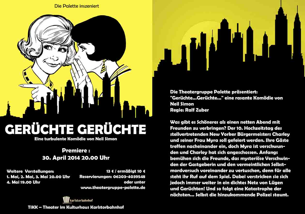 Die Premiere findet am 30.04.2014 im TiKK in Heidelberg statt. Weitere Termine: 1.Mai, 2.Mai, 3.Mai um 20:00 Uhr 4.Mai.2014 um 19:00 Uhr